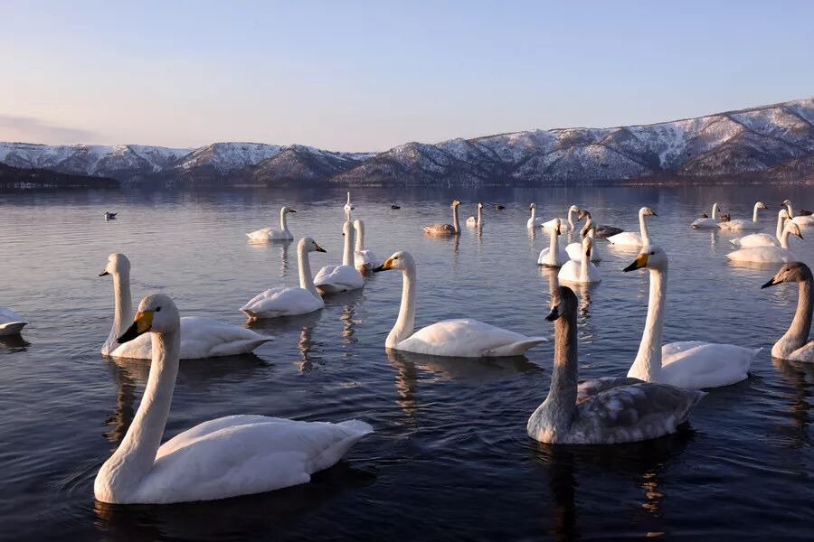 天鹅戏水。(作者:八月的紫幽 。拍摄地点:北海道屈斜路湖)