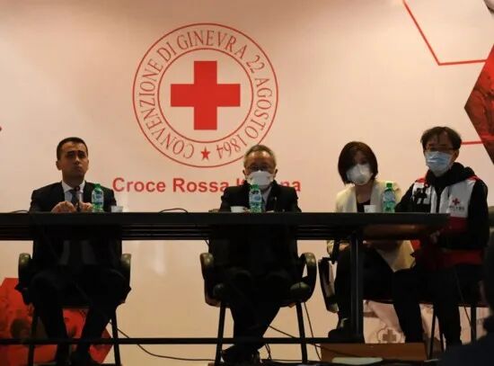 3月13日、ローマ・ラツィオ州赤十字本部で共同記者会見に出席するイタリアのディマイオ外相(写真左から1番目)、中国の李軍華駐イタリア大使(写真左から2番目)、中国イタリア支援医療専門家チーム。
