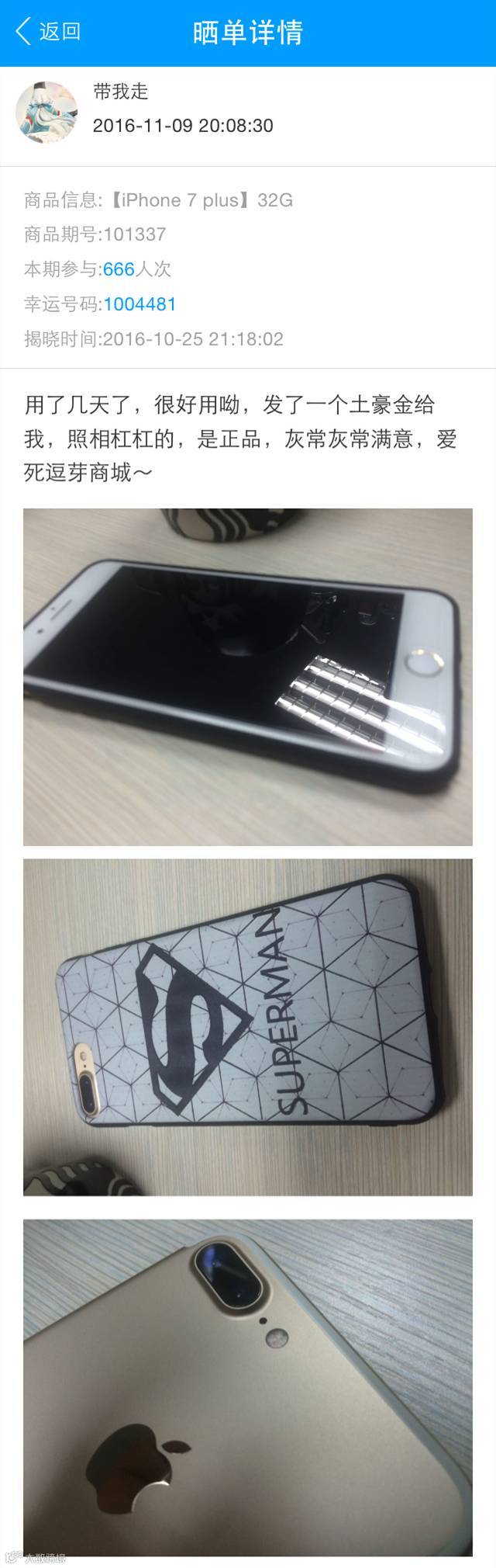 用600多块就让我拿到了iPhone 7 plus,这是我之前想都不敢想的事情!爱死逗芽商城啦!而这也让我知道,有时候专注才会有收获!买的多少和中奖几率是成正比的~我身边的同事们都好羡慕我,也纷纷下载逗芽商城来玩。有个同事第一次玩就拿到了200块的购物卡,她很感谢我给她推荐了逗芽商城还请我吃了一大堆零食,哈哈哈!