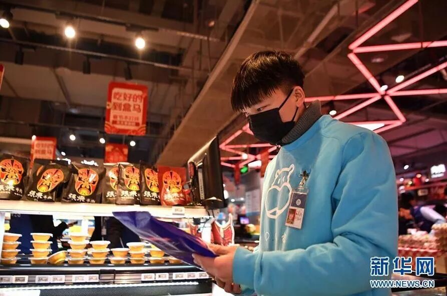普段は陝西省西安市にある雲海肴の店員として働いているものの、今は「従業員のシェアリング」を通して、同市にある盒馬鮮生で働いている高偉さん(2月6日撮影)。