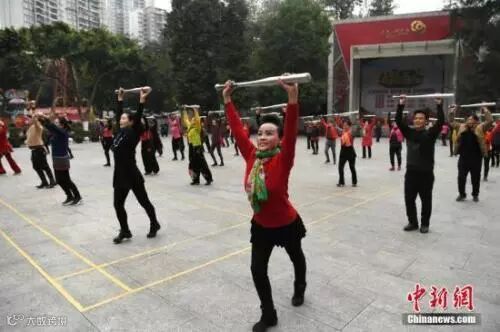 野球のバットを手に広場ダンスを踊る高齢者(撮影・陳超)。