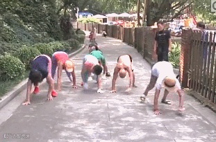 しかし近寄ってみると、その「巨大な虫」は実はおじさんやおばさんで、彼らは単にエクササイズをしているだけということをあなたは知ることになる。彼らは手足を同時に使い、四つん這いになって進んでいく。これは一時期、彼らの間で非常に流行ったエクササイズで、広々とした場所で、腕も使い、頭を振りながら這いまわる様子はまさに「奇妙」以外のなにものでもない。