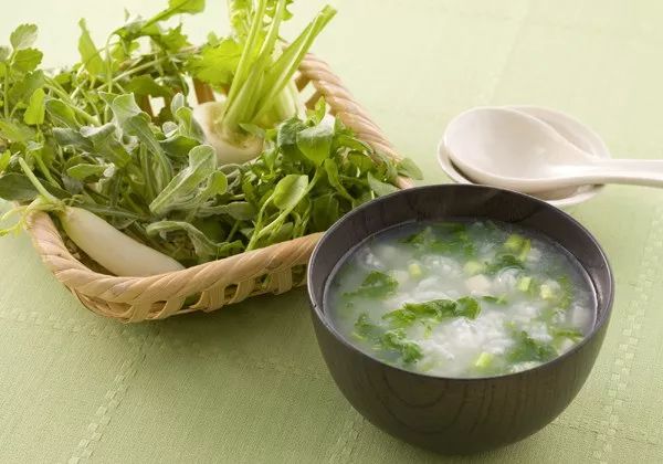 七草粥是将白粥里加入春天的七种野菜熬制而成,这七种野菜分别为芹菜、荠菜、鼠曲草、繁缕、稻菜、芜菁和萝卜(セリ、ナズナ、ハハコグサ、ハコベ、ホトケノザ、スズナ、スズシロ)。