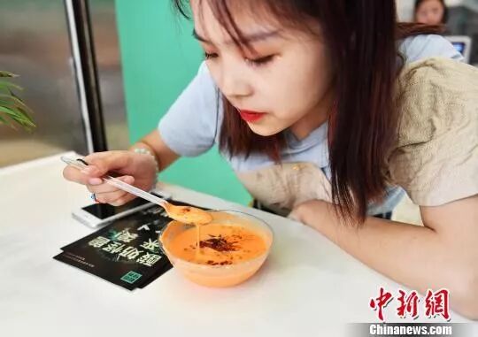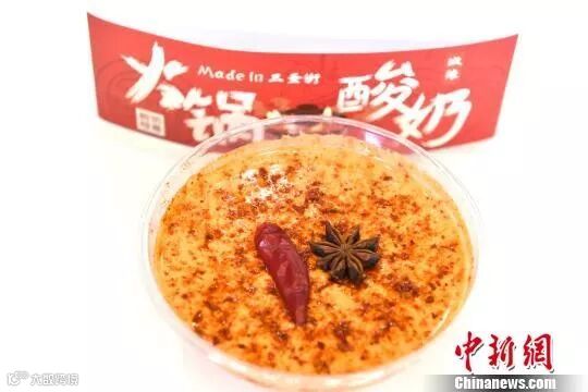 四川省成都市の春熙路三聖街にあるヨーグルトドリンクショップで15日、話題の火鍋ヨーグルトを取材した。