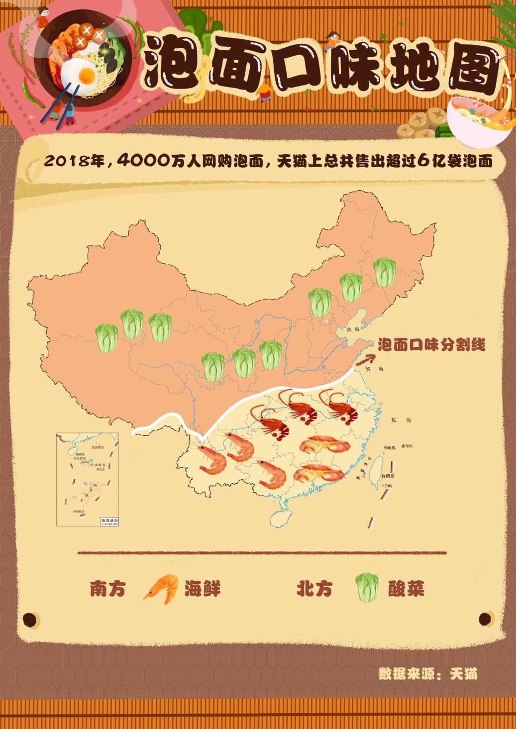 だが、これらのニッチな味のほか、昔からの主流である「海鮮味」と「老壇酸菜(青菜の古漬け)」味は、やはり、中国人がインスタント麺を選ぶ際の第一の選択肢となっている。地域分布で見ると、長江が「南の海鮮、北の酸菜」という南北の味の好みを分ける境界線となっている。