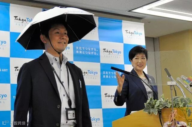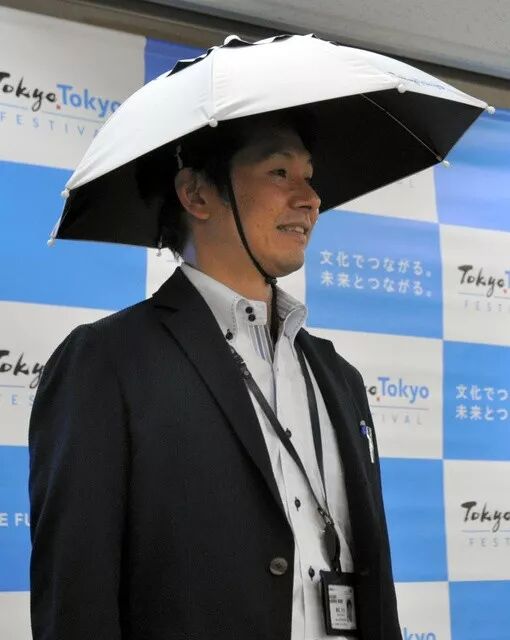 小池百合子在记者会上表示,“东京奥运会期间,防暑将是一个很大的问题。这款遮阳伞便是其中一个解决方案,遮挡阳光的同时,还可以解放双手。”“有些男士可能不好意思打伞遮阳,不妨试试这款头戴式遮阳伞。”