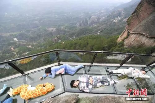 2017年3月21日、世界睡眠デーに当たるこの日、湖南省平江石牛寨の断崖にあるガラス桟道にアニメのキャラクター・パジャマを着て横たわる観光客。様々な姿で眠るという睡眠パフォーマンスを通じて、健康な睡眠を呼びかけた。