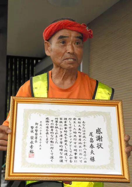 2018年8月,山口县一名两岁男孩在山林与家人走失,当地警方接到报警后,出动千人展开救援活动,最终无果。78岁的尾畠春夫在了解情况后,自告奋勇前往事发地参与救援,在男孩走失68小时后,最终找到了他。据悉,尾畠春夫一直以来默默无闻的参加各种志愿活动,比如家乡登山道路的修整工作、全国各地的灾后重建工作等,被人们称为“超级志愿者”。