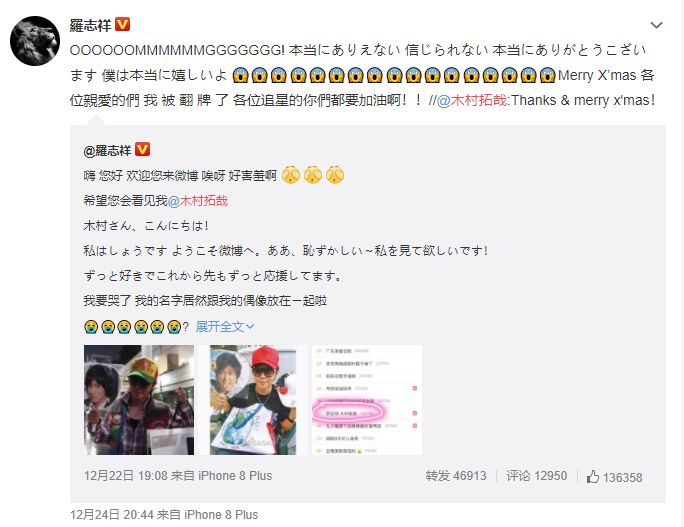 クリスマス前日、羅志祥の微博にそんな憧れのキムタク本人からコメントが寄せられた。コメントでキムタクは羅志祥に対して感謝の気持ちを示しただけでなく、素敵なクリスマスになるようにとのメッセージも。こんな「クリスマスプレゼント」に当の本人である羅志祥はもちろんのこと、ネットユーザーも騒然となった。羅志祥はすぐさま日本語でキムタクに感謝のメッセージを送っただけでなく、自分のファンたちに向けて、「みんな見て!なんとキムタクから返事が!スターの追っかけをしているみんなも諦めずに頑張ってね!」と励ましのコメントを綴った。