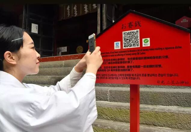 日本栃木县日光市日光二荒山神社近日推出了扫码支付香火钱服务。