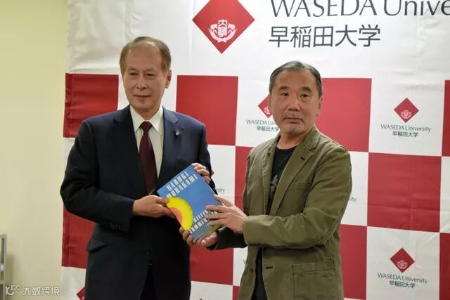 村上春树(右)与早稻田大学校长镰田薰(左)(图片来源:朝日新闻网站)