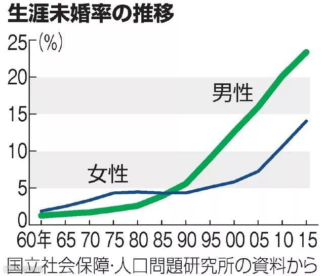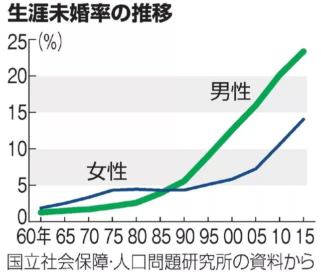 日本终生未婚男女比例变化(图片来源:朝日新闻网站)