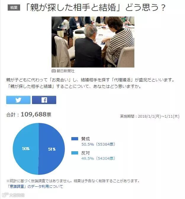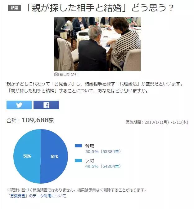 今年1月,雅虎日本针对“代理婚活”进行了一项网络调查,共收集到约11万份回答。结果显示,50.5%的人对这种形式表示赞同,49.5%的人则表示反对。有被调查者认为,由父母代理相亲“有点让人不好意思”、“结婚后如果过得不好,会埋怨父母吧?”也有人认为,“这倒也是结识异性的一种途径”、“相识的方式其实并不重要,重要的是能遇上对的人”。