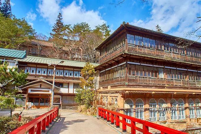 走过红桥,呈现在眼前的是建于原禄四年(1691年)的木造建筑本馆,它也被指定为文化财产。在这里,能够体验到电影中的氛围。同时,四万温泉对肌肤也很有好处,据说饮用温泉水对于肠胃病也有疗效。