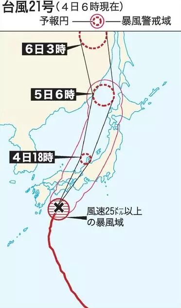 今年的第21号台风已于当地时间4日凌晨4时从日本足摺岬南部向北部移动,预计将于4日中午经过四国登陆纪伊半岛。届时,西日本乃至东日本地区将迎来强烈的风雨天气。