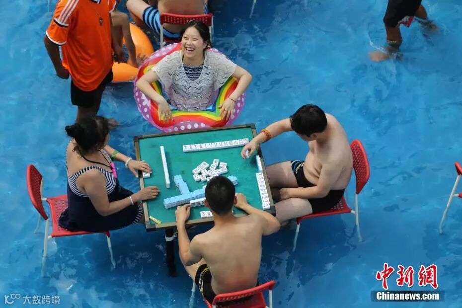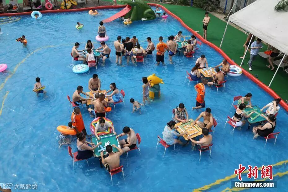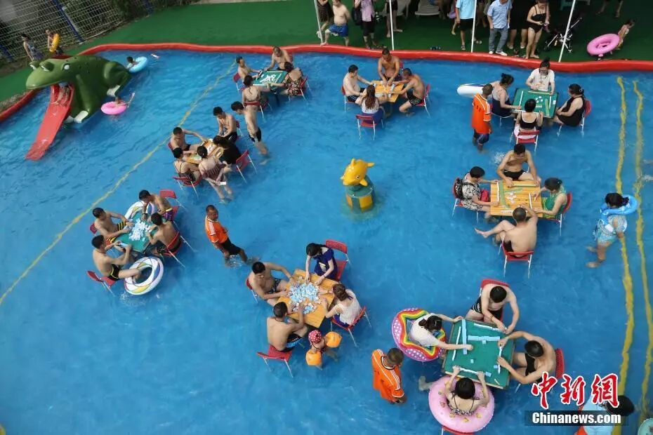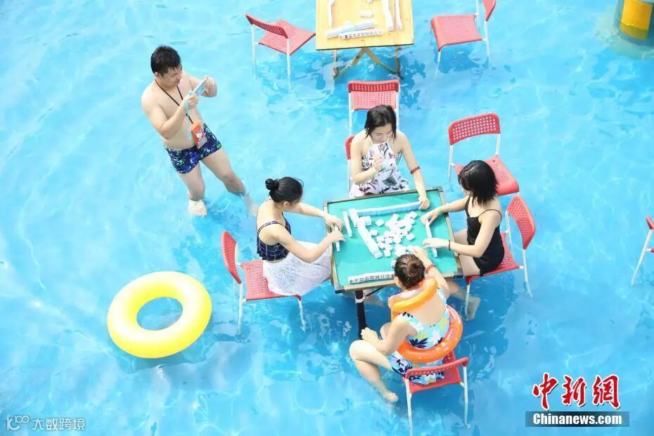 上半身裸の男性と水着姿の女性が一緒にテーブルを囲み、麻雀を楽しんでいる。足を麻雀卓の下の冷たい水に浸し、いかにも涼しそうだ。重慶の遊園地「洋人街」のプールが打ち出した「水上麻雀」が、多くの来園客の注目を集めている。十卓ある麻雀卓には空席がなく、涼しい気分で麻雀を楽しんでみようと列に並ぶ来園客もいるほどだ。