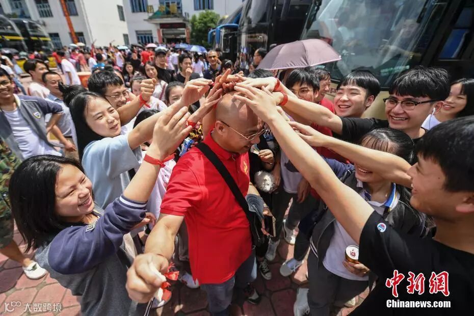 先生の頭に手を当て願掛けをする受験生たち(撮影・楊華峰)。