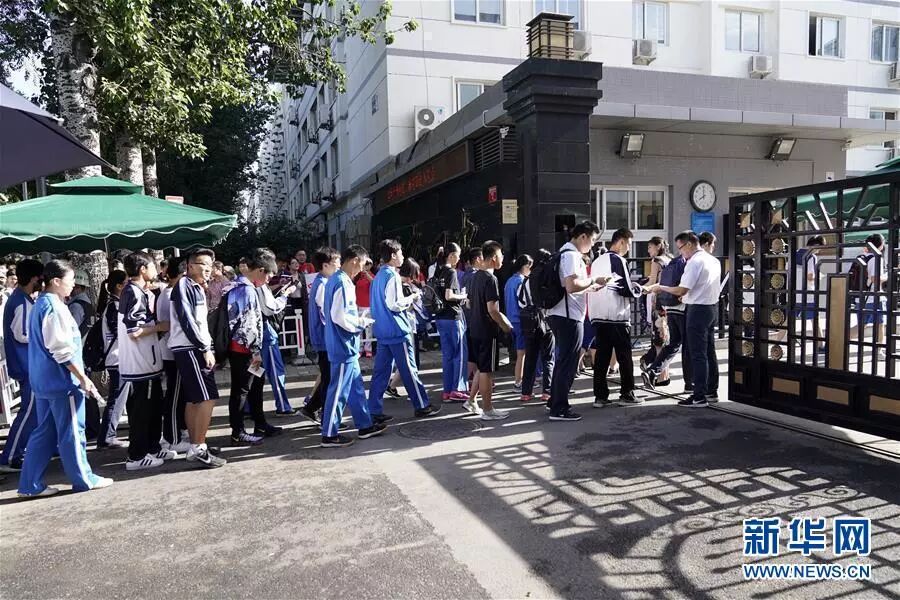 北京第四中学の試験会場に入っていく受験生たち(撮影・沈伯韓)。