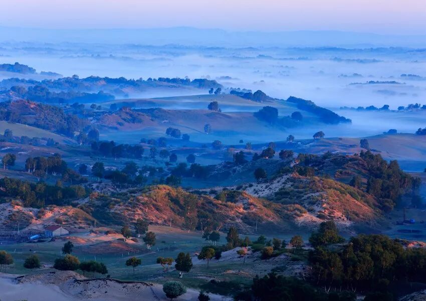 「内モンゴルの大草原、早朝、大草原の丘に一人で撮影して幻想的な情景を撮影しました。」