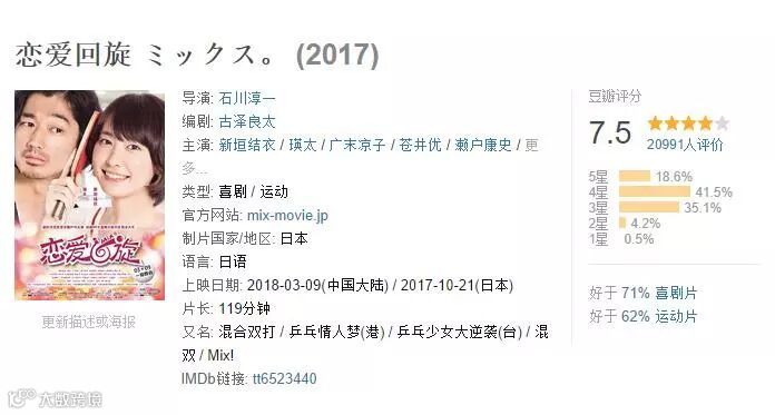 「ミックス。」は、日本で興行収入15億円を記録した。2020年の東京五輪が近づき、日本でも抜群の知名度を誇るスター選手・福原愛選手の活躍などで卓球への注目度も高まっている。そんな卓球をテーマにした「ミックス。」は、「熱血」を好む日本市場にも、東京五輪を意識した内容としてもピッタリだったため、高い注目を集め大ヒットとなった。
