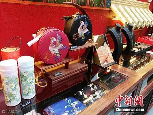 また、故宮文化財の模様がシルクスカーフや鞄、水筒などに使用されている。昨年注目を集めた文化財「千里江山図」はペン立てのデザインに採用され、故宮の猫も置き物のデザインに用いられている。