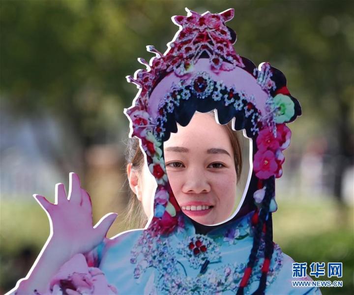 北京園博園内で記念撮影する観光客(5日撮影)。