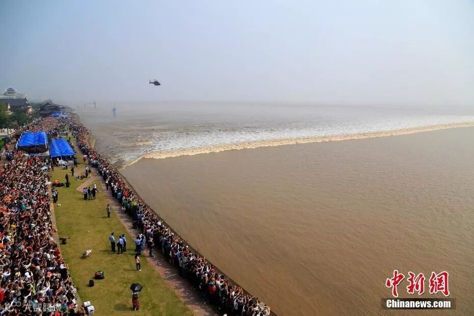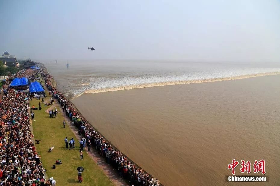 浙江省海寧市塩官では7日、同市の銭塘江で旧暦8月18日(今年は10月7日)に生じる「天下一の大潮」の壮大な光景を一目見ようと、中国各地から計12万5千人の観光客が訪れていた。