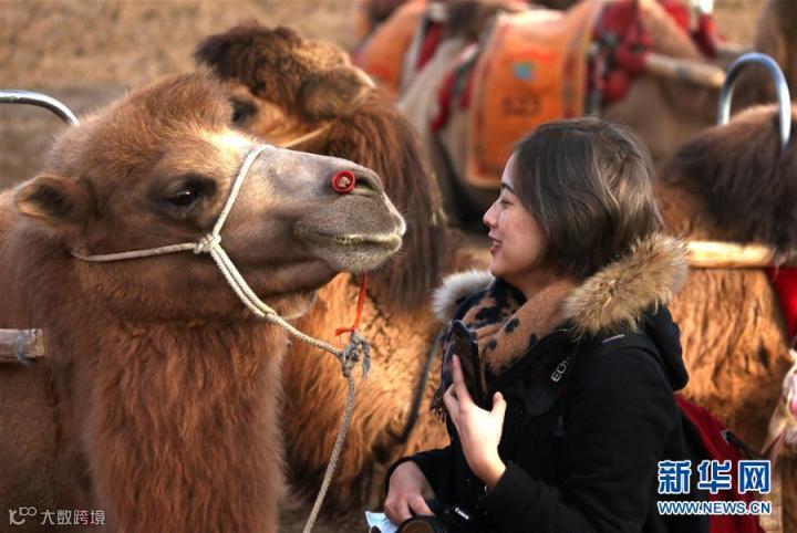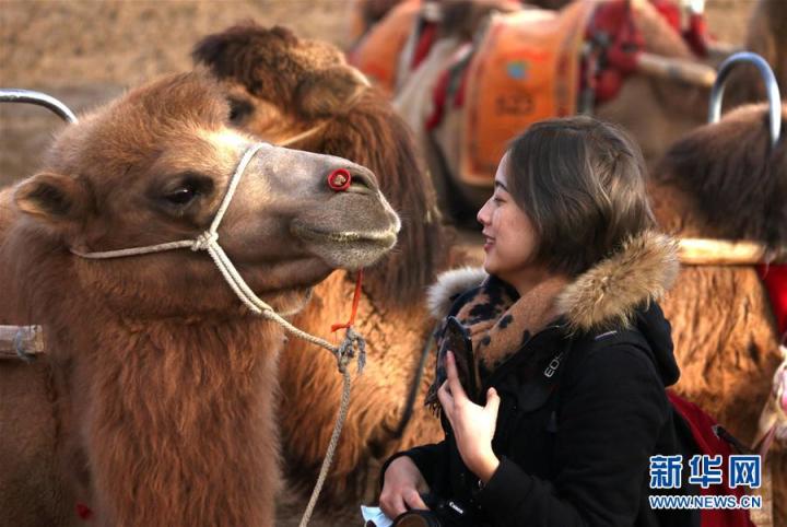 甘粛省敦煌市鳴沙山月牙泉景勝地で楽しむ観光客(6日撮影)。