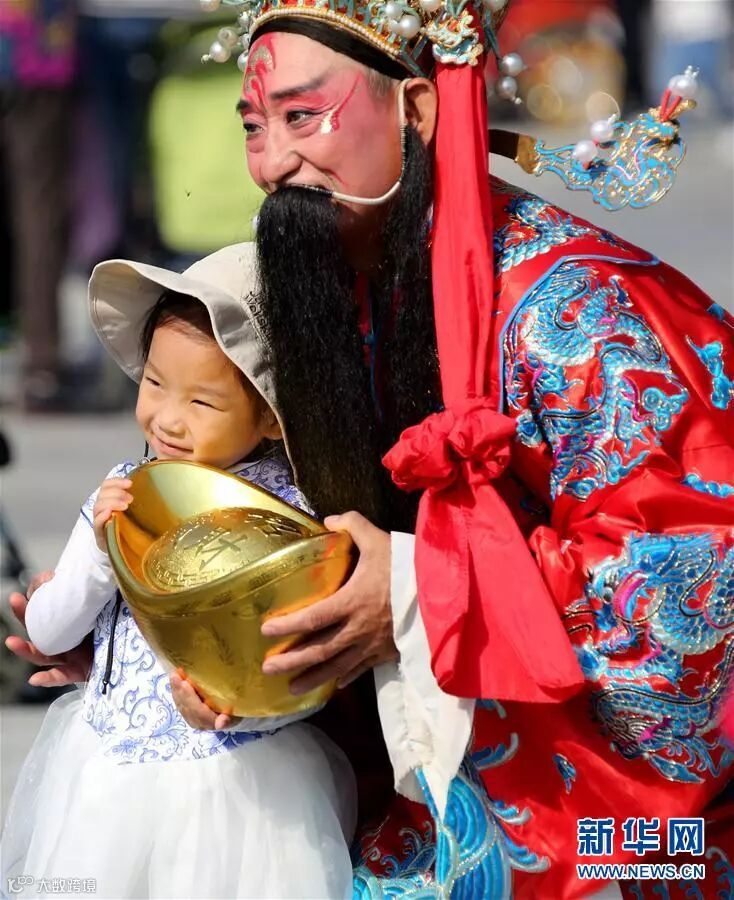 北京園博園内で「財神」と写真撮影する子供(5日撮影)。