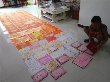 筆者は胡君の家で、胡君が小学校で取ったたくさんの賞状や栄誉証書、詩歌・散文が掲載された雑誌などを見せてもらった。その中には、全国漢字作文テスト・作文コンテスト第五級トライアルで「優秀」を受賞したり、「第12回全国少年児童手紙文化活動」の綏徳地区小学生の部で一等賞を受賞したり、同市第14回運動会青少年グループ50メートル背泳ぎで6位に入賞したりなど、大きな大会で上位に入った際の賞状などもたくさんあった。