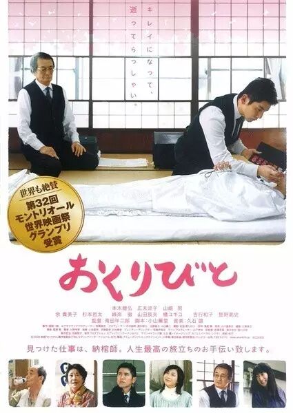 「おくりびと」では、プロのチェロ奏者だった主人公の小林大悟がある日突然失業し、旅行代理店の求人だと思い込んで受けた面接に合格した結果、「おくりびと」になる。最初のうちは心理的に抵抗があったものの少しずつその仕事に慣れていく。しかし、家族に反対されるなどの挫折を味わい、頭を悩ます。最終的には、数多くの納棺をこなし、この仕事が神聖なものであることを悟り、一人前の納棺師となる。「おくりびと」は、「『死』というのは、遠い新しい場所に通じる扉にすぎない」という信念を伝えている。