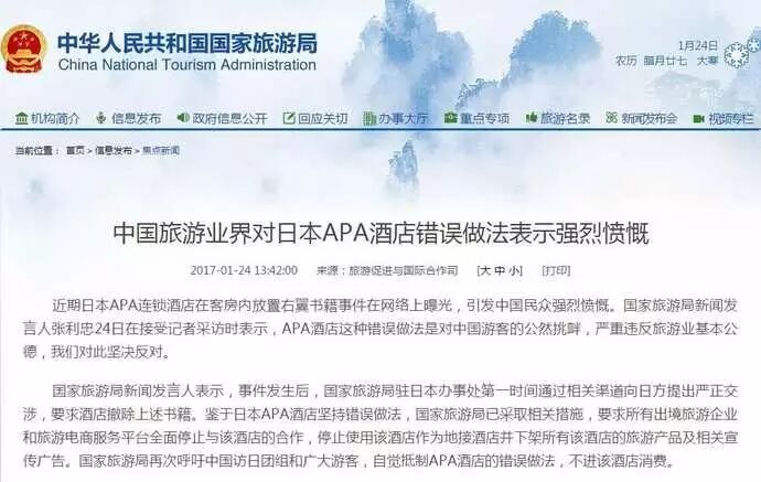 日本のアパホテルの客室内に右翼的な書籍が置かれていたことが最近報道されている件について、国家観光局報道官の張利忠氏は24日に発表した談話の中で、「本件が明らかになった後、中国国家観光局東京駐在事務所は直ちに関係ルートを通じて日本側と厳正たる態度で交渉に臨み、同ホテルからこれらの書籍を撤去することを求めた。また、同ホテルがこの誤った行為を改めない点についても、同局はすでに対応措置を実施しており、海外旅行を取り扱う旅行会社と旅行eコマースサービスプラットフォームに同ホテルとの提携を全面的に停止し、同ホテルを現地受入れホテルとして利用することの停止、同ホテルを含むあらゆる旅行商品及び宣伝活動の停止を求めている」ことを明らかにした。