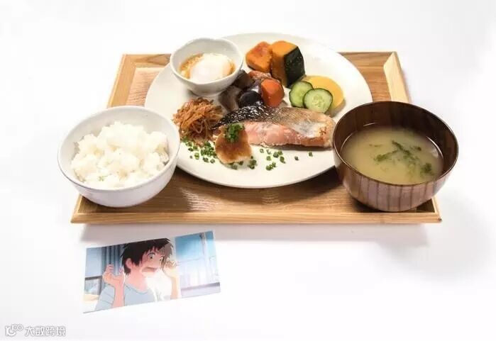 主题咖啡屋用食物再现了片中诸多经典画面,例如主人公泷和三叶的早餐、泷打工餐厅的披萨、绿意盎然的糸守湖面包炖菜等。
