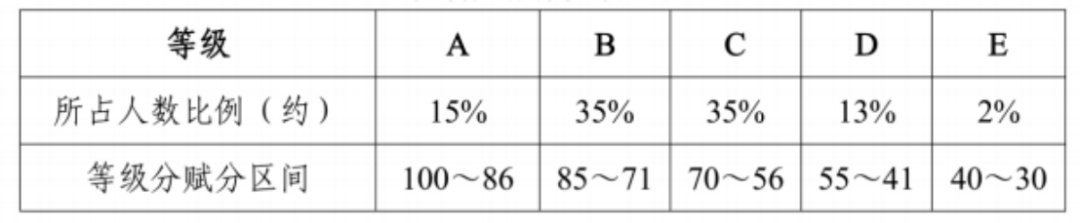 考生在政治、地理、化学、生物4门科目中选2门参加考试。每名考生按其卷面分在该选考科目的考生群体中的排序,从高到低划分为A、B、C、D、E共5个等级,各等级人数所占比例分别约为15%、35%、35%、13%和2%,等级分赋分区间分别为100-86,85-71,70-56,55-41,40-30,再根据“等级分换算公式”算出考生等级分,最后计入高考总成绩。