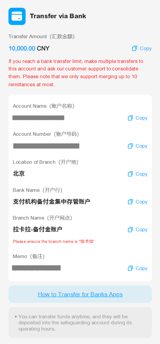 Please allow up to 1 hour for the funds to be credited to the safeguarding account, as this can vary based on the processing speed of your Chinese bank.