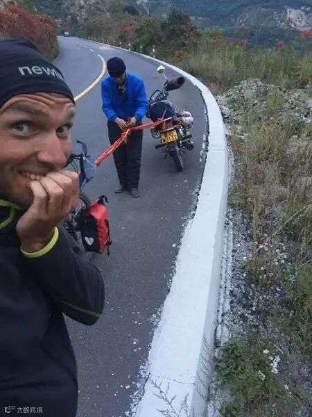 2015年9月17日、北京郊外で疲れのために立ち往生したシュレーダーさんを、現地のオートバイの運転手が助けてくれた。