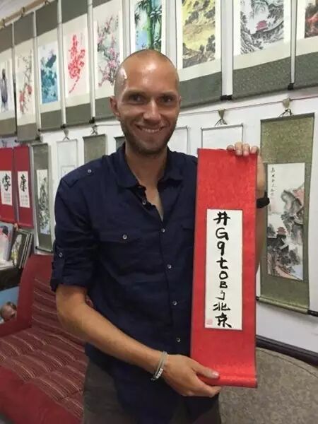 2015年9月20日、北京の書画店で「グノイーンから北京へ」と書かれた作品を贈られたシュレーダーさん