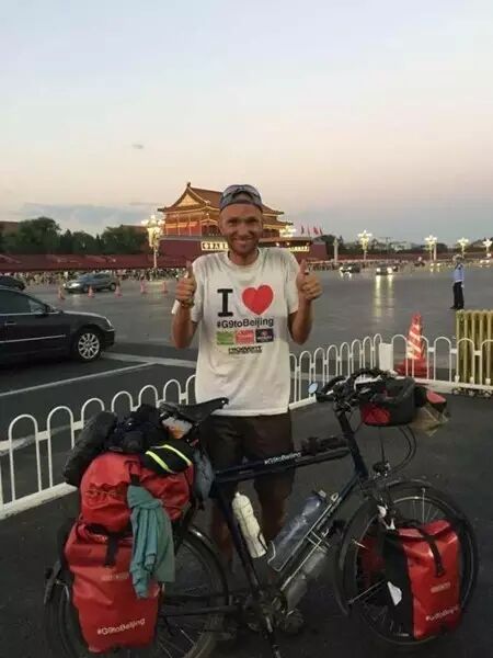2015年9月18日、自転車に乗り約5カ月、8カ国を旅し、ついに北京に到着した後、天安門の前で記念撮影したシュレーダーさん。
