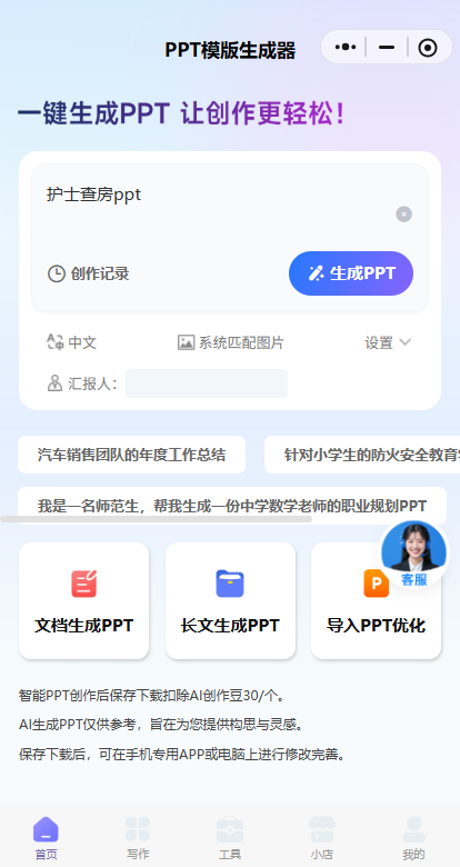 AI写作高效生成器在当今快节奏的工作和学习环境中,PPT 作为信息展示和沟通的重要工具,其制作效率和质量备受关注。然而,传统的 PPT 制作软件操作复杂、耗时费力,让许多人望而却步。今天,我们要向大家隆重介绍一款全新的 PPT 制作小程序——PPT模板生成器,它将为你带来前所未有的便捷与高效。