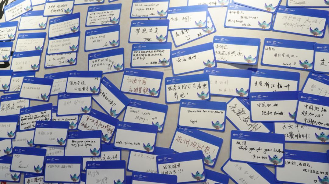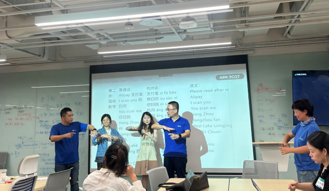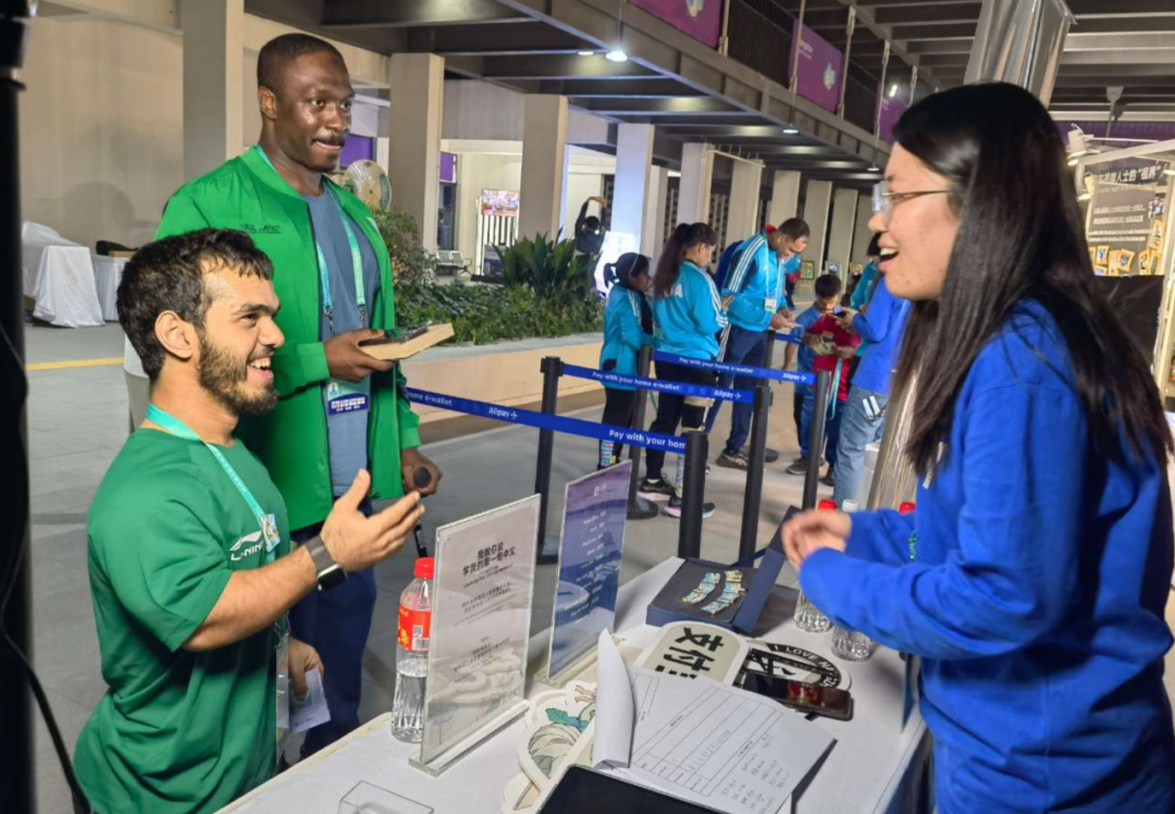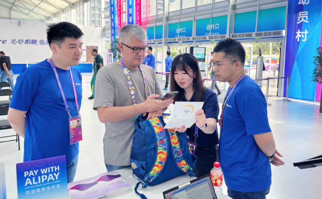 由于口译专业背景,加上曾经在大运会的工作经历,今年 6 月,饶志腾经推荐,成为了蚂蚁集团驻亚运村的村长,负责带领一群双语大使,帮助来自各国的运动员和教练员们,通过支付宝或他们国家的电子钱包便捷支付。