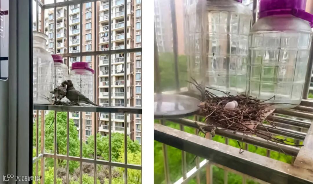 「附近的公园拆了,这两只小鸟便搬到了我家阳台上,每天欢快地叫,声音可响亮了。这几天,两只相亲相爱的小鸟又有了爱的结晶。真希望它们能一直陪伴我。」