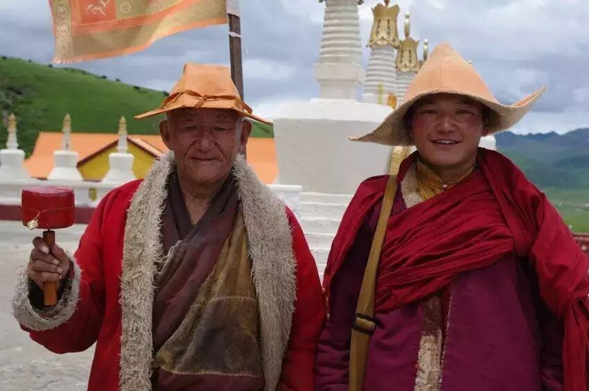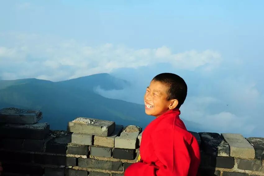 来到了心仪已久的色达,参观西藏寺院时遇到了这对父子。父亲是个很虔诚的佛教徒,手里不停地转着转经轮。蓝天、青山、白寺,还有藏传佛教徒父子俩穿的胭脂红的法衣,很美的画面,很喜欢的照片。