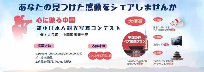 “镜彩中国-日本人游中国摄影大赛” 由人民网和中国国家旅游局联合主办。伴随着中日两国旅游交往的日趋密切,旅游已成为两国国民认识对方、了解彼此的主要途径之一。“镜彩中国-日本人游中国摄影大赛”面向全球日本人征集以游走中国为主题的摄影作品,旨在以日本游客的视角展现中国的美景美食、风俗文化和人文风情等,为热爱旅游、热爱摄影的中日两国网友提供一个展示与交流的平台,为更多的日本读者打开一扇走进中国、感悟中国的窗口。