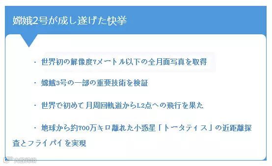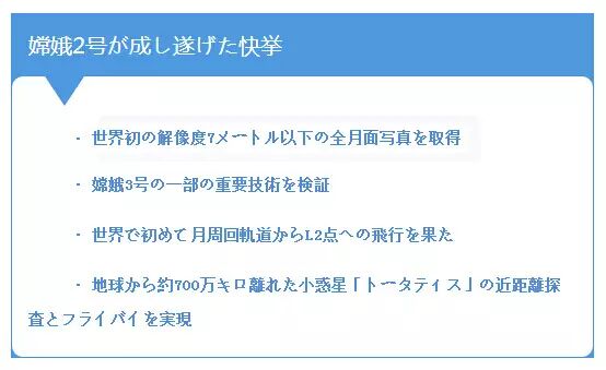 2010年10月1日に打ち上げられた月探査機「嫦娥2号」は現在、すでに太陽系の小惑星になり、太陽の周りの楕円形軌道を周回している。嫦娥1号衛星システム総指揮・チーフデザイナーの葉培建氏は「2020年頃に地球付近に戻る見通しだ」と話した。観測データによると、嫦娥2号の宇宙探査距離は、2014年中頃の時点で1億キロを突破した。