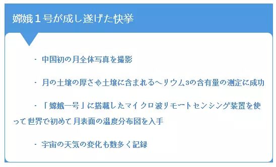 中国初の月周回探査衛星「嫦娥1号」は2007年10月24日に打ち上げに成功、同年11月20日にCCD立体カメラでの撮影を始め、2008年5月12日までに南緯・北緯70度以内の月面の全区域をカバーする画像データを収集、ミッションを完成した。