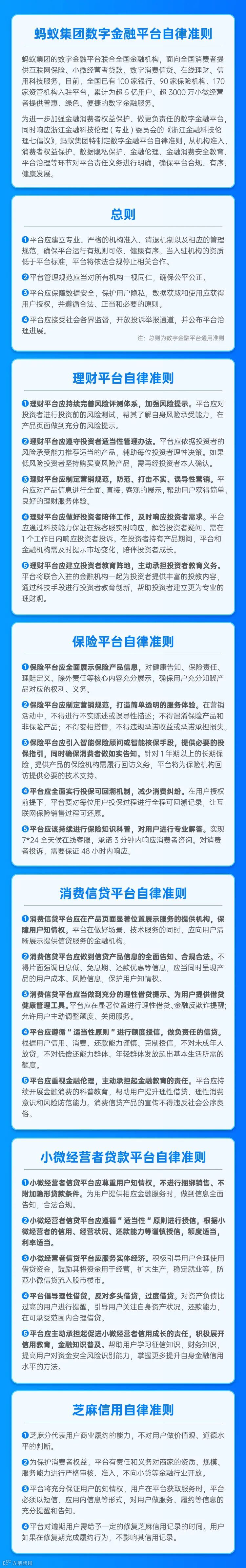 3月12日,蚂蚁集团公布了数字金融平台自律准则,希望进一步加强金融消费者权益保护、做更负责任的数字金融平台。