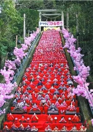 千葉県勝浦市の遠見岬神社の「かつうらビッグひな祭り」は、今年は2月26日から3月6日まで開催されるため、すでに祭りの準備が始まっている。神社の前にある60段の石段に1500体のひな人形を飾った様子はまさに壮観だ。また、各商店も3万体あまりのひな人形を飾り、商店街はひな祭りムード一色となる。