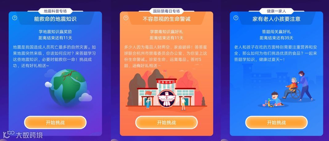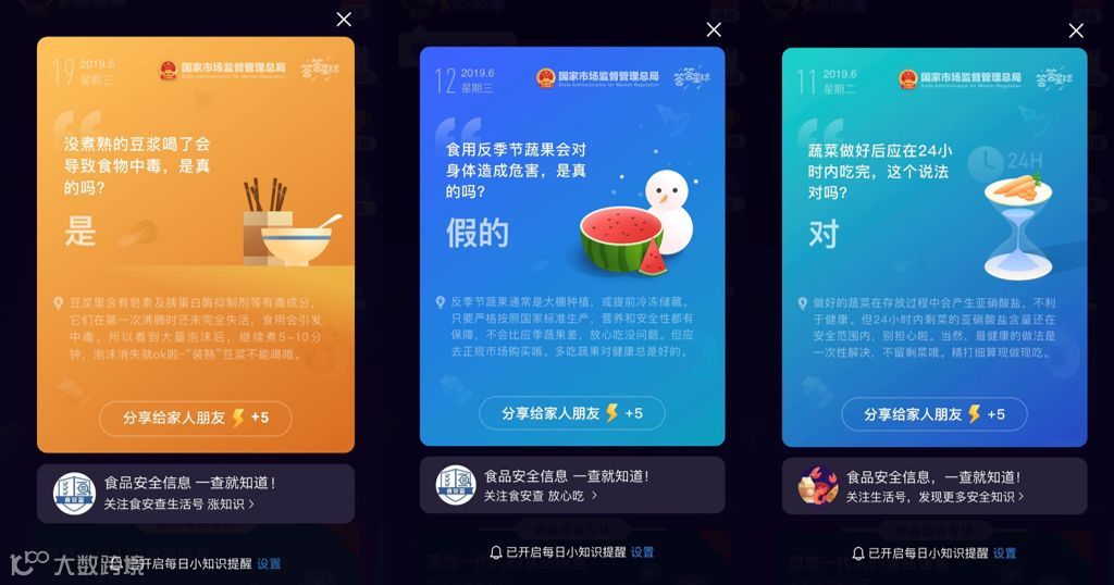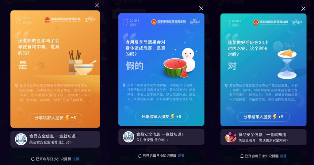 在刚结束的「国家食品安全周」里,有超过2000万人通过支付宝里的「答答星球」小程序参与全民食品安全知识竞赛,一共PK了5亿场。据说,这可能是线上参与规模最大的食品安全科普活动了。