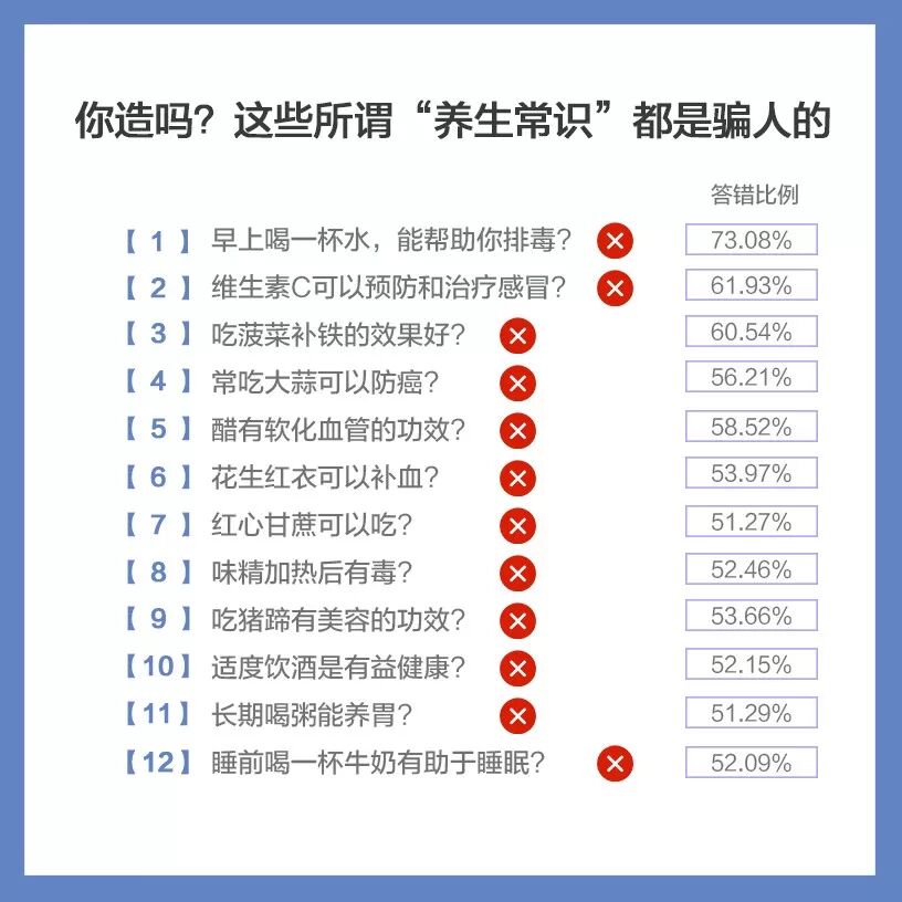 竞答结果令人瞠目,错题率高达50%。答错最多的,就是父母经常发给我们的那些「养生常识」……在200多个涉及食品谣言的题目中,有20道题考倒了半数人,不少年轻人都在「陈年老谣」上栽了跟头。
