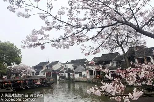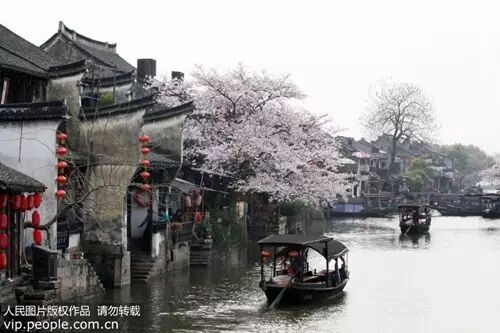 古い町並みの残る浙江省嘉興市の西塘鎮では毎年3月になると、桜が開花する。この街では、情緒あふれる古い街並みが桜の美しさをさらに引き出している。遊覧船に乗って、水郷からその桜を観賞すると、独特の情緒を楽しむことができる。